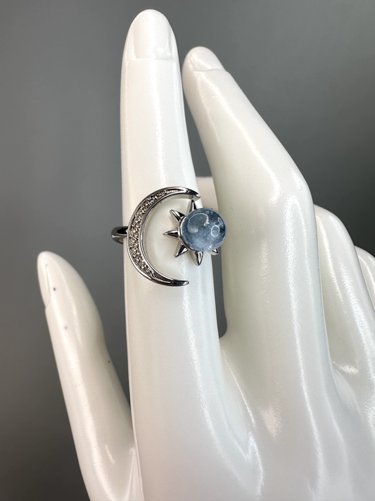 Aquamarine Sun and Moon Ring | Adjustable | Silver Plated