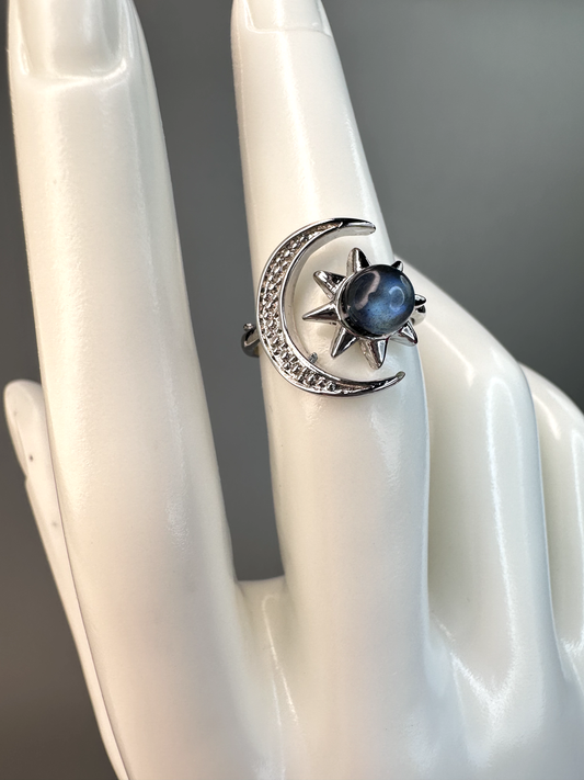 Labradorite Sun and Moon Ring | Adjustable | Silver Plated | Flashy